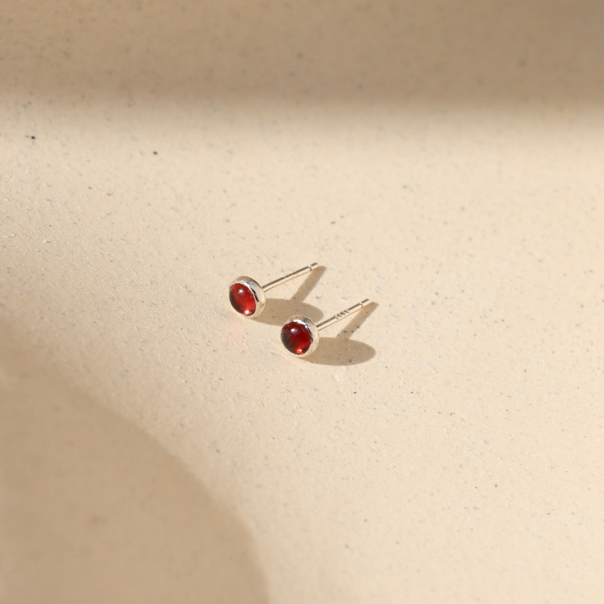 Gold filled bezel set earrings with July's birthstone, red Ruby gemstones on a ceramic dish
