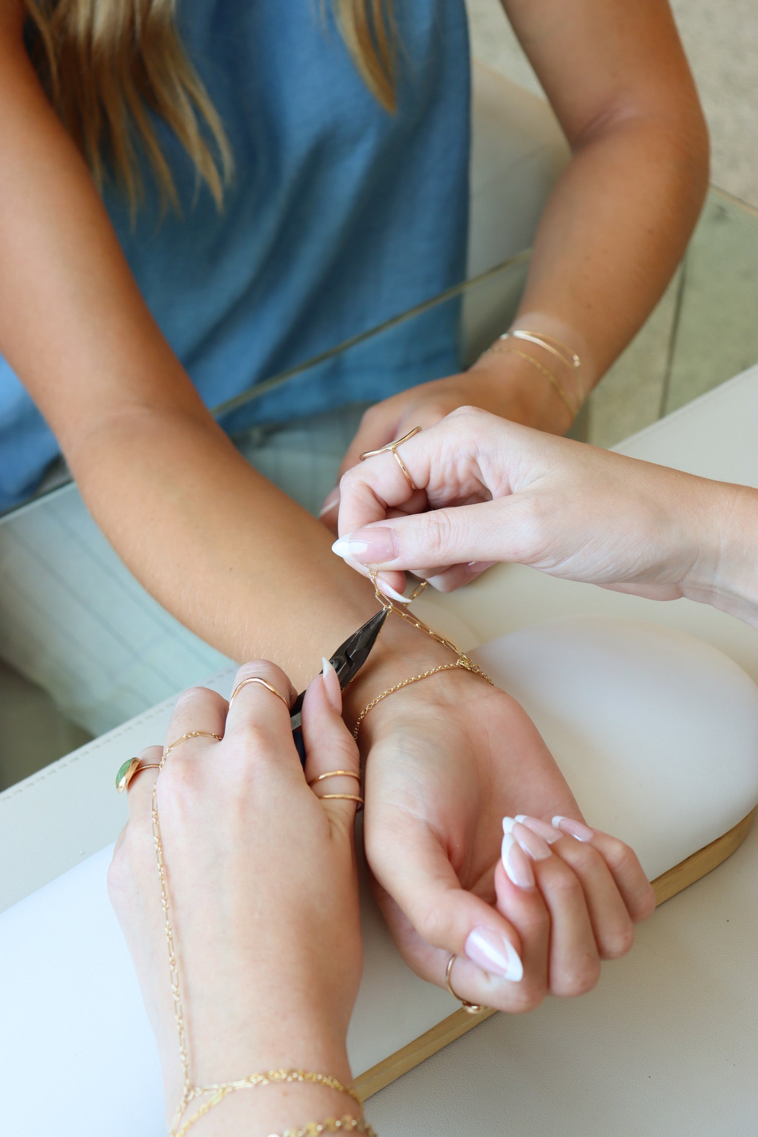 Permanent jewelry is a simple, no-clasp way to wear custom jewelry that’s designed to stay with you. Through a quick and pain-free micro-welding process, we create a seamless piece that stays put–until you decide to take it off or it naturally wears down. Think of it as jewelry made for your everyday, effortlessly layering into your life.