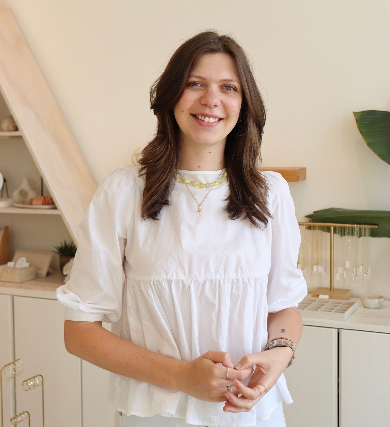 If you’ve ever opened a Token email or double-tapped one of our dreamy photos, there’s a good chance Lexi was behind it. She creates our newsletters, takes our photos, and helps bring all things Token to life with the marketing team. Her favorite pieces? Anything with the Alexandra Chain and bold gemstone rings like the Turquoise Nomad. Outside the studio, she’s usually hanging with her Frenchie, Willie, horseback riding, booking last-minute trips, or thrifting her next great find on Marketplace.